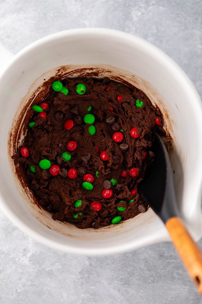 Easy to make and easy to eat! Treat your chocolate lover to these double chocolate cookies loaded with chocolate chips and M&M’s. I love the way the color of the M&M’s pops against the chocolate cookie dough. They look (and taste) so fun and festive. The cookie dough is similar to a rich homemade chocolate brownie in a cookie form, and the chocolate chips and M&M’s give it texture and shape. Be sure to try my tip for getting perfectly shaped cookies.