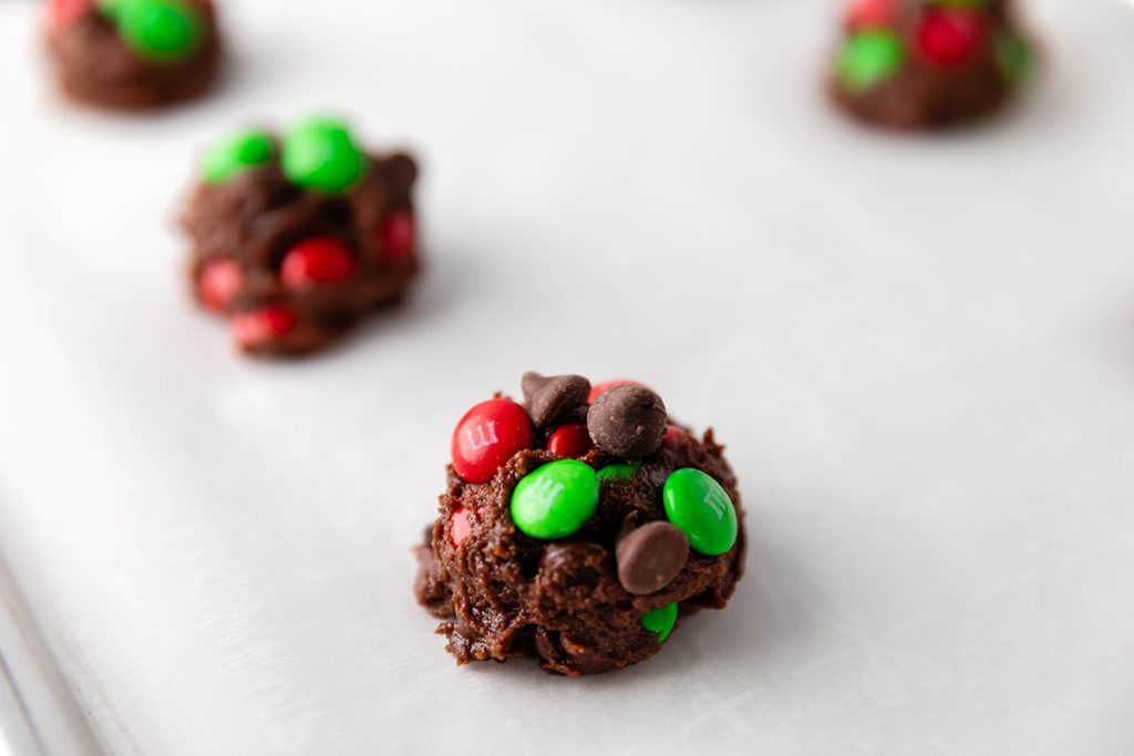 - Use a cookie dough scoop to measure cookie dough and add additional M&M’s and chocolate chips to top of cookie dough before baking.