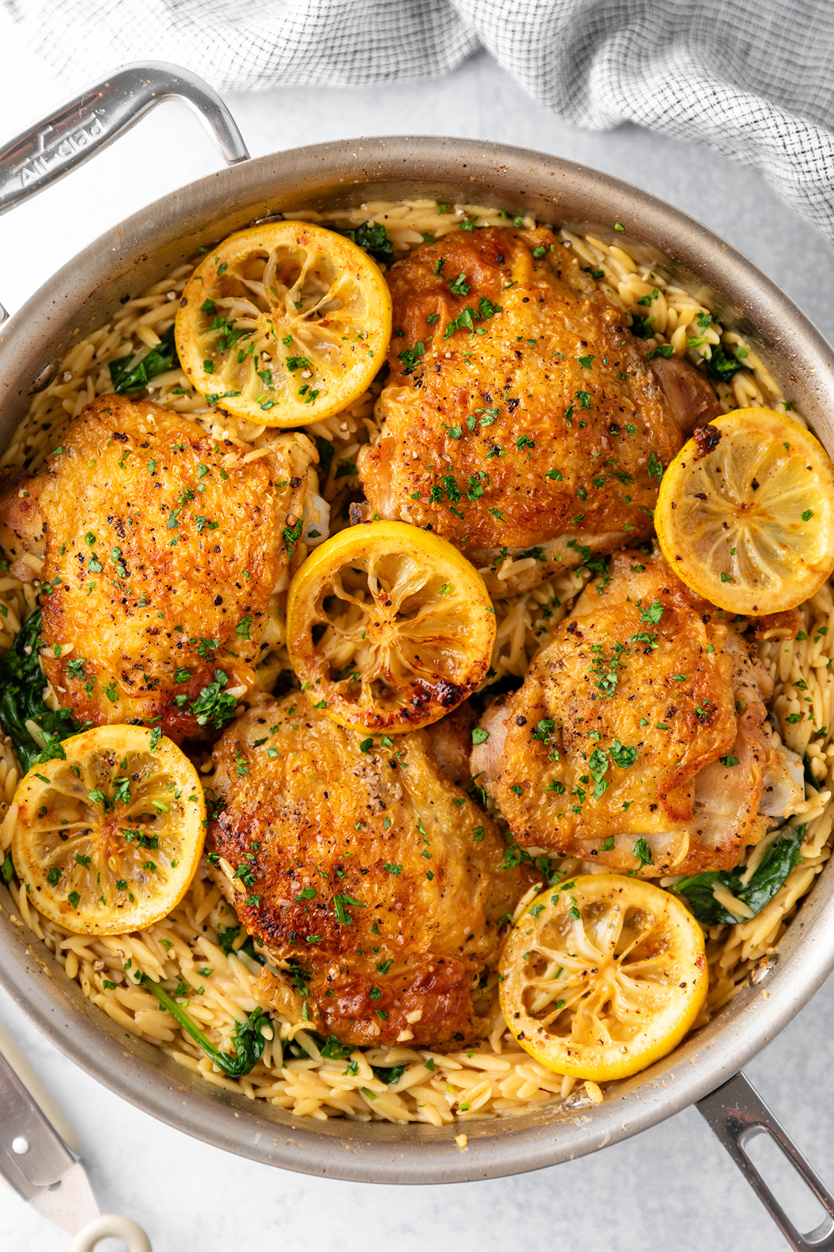 Juicy golden brown lemon garlic chicken thighs with flavor-packed orzo and baby spinach.