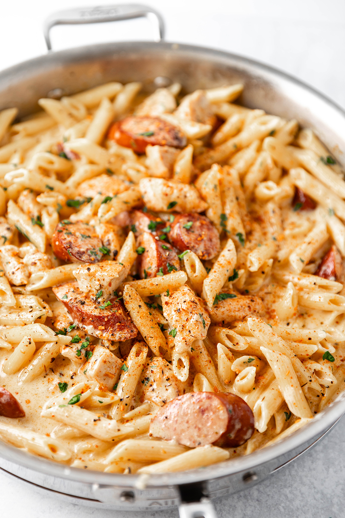 Tender chunks of chicken with smoky pieces of sausage in a rich and delicious homemade alfredo sauce.