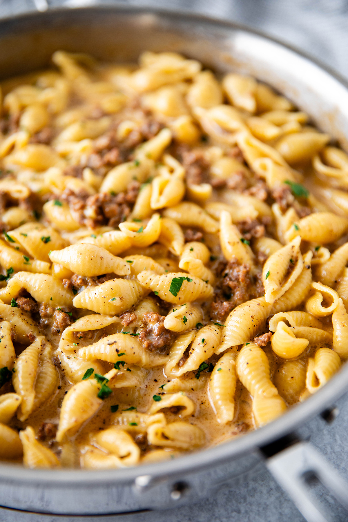 Tender ground beef and shells in creamy homemade sauce.