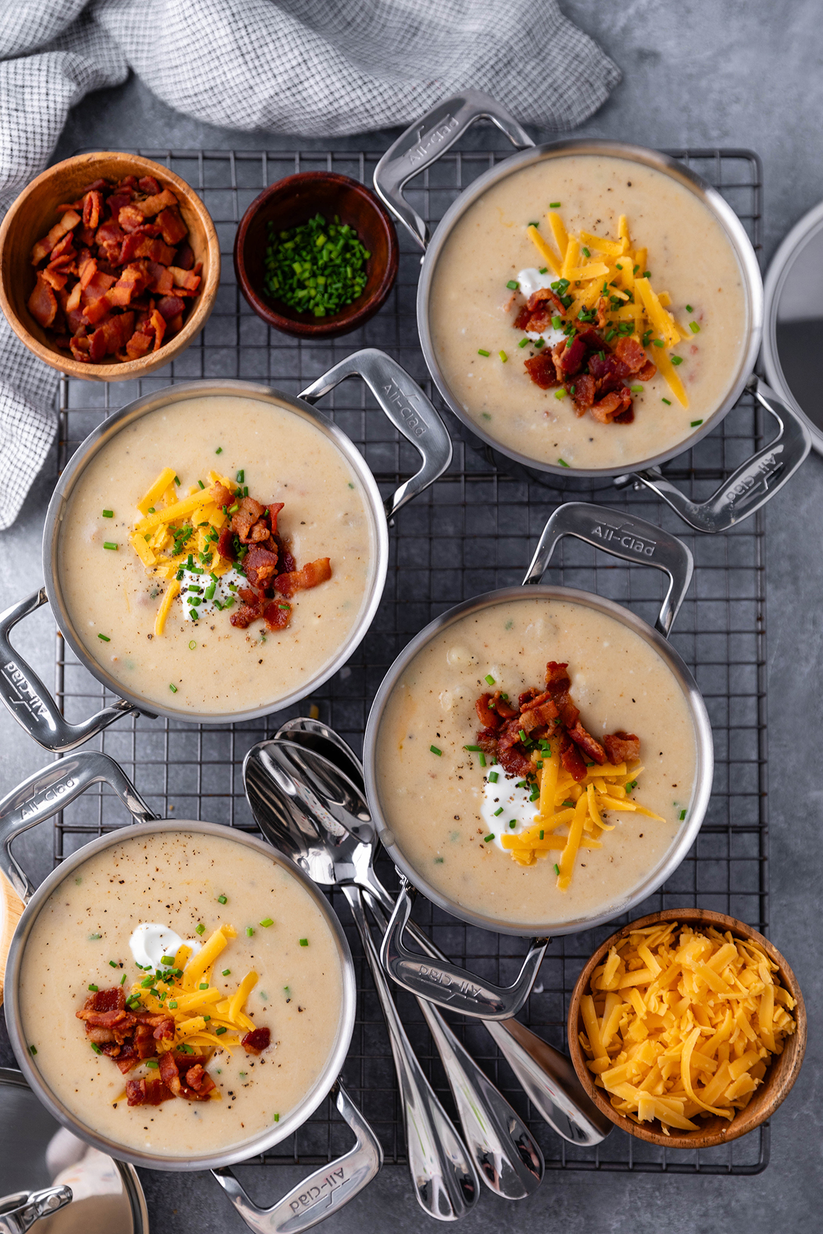 A cheesy potato soup loaded with all your favorite baked potato toppings.